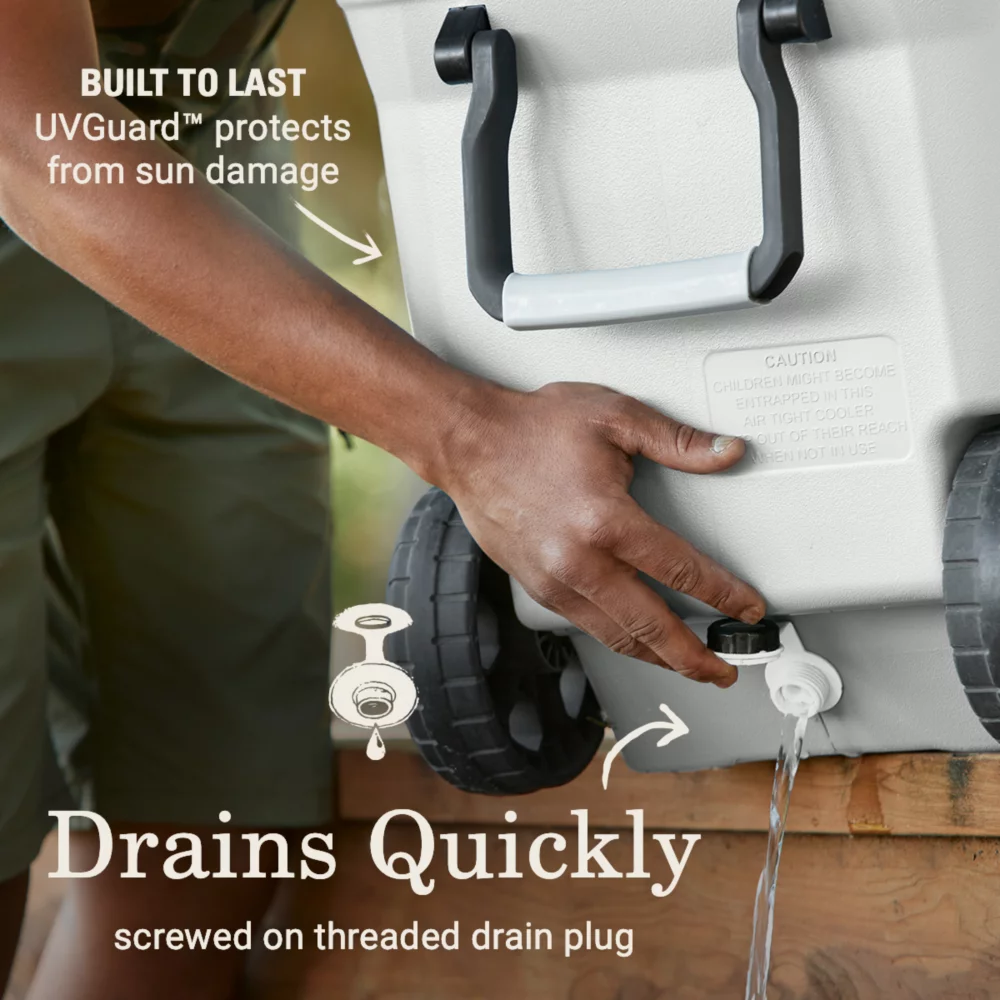 Meet the Atlas Series Coolers—thoughtfully designed for weekends on the water and rallying on the sidelines. The Atlas Series 100-Quart Marine Cooler With Wheels is made to be on deck all day long—that’s why we added a UVGuardâ„¢ coating to protect against the sun’s damaging rays. Plus, the stainless steel hardware resists rust while you’re reeling in the day’s catch.