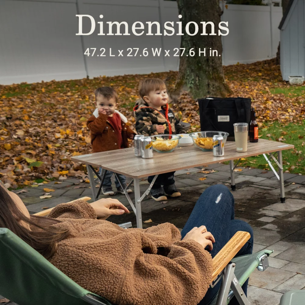 Perfect for the patio or the campsite, the Coleman® Living Collection Folding Table is your go-to for getting together outside. The lightweight aluminum frame makes it easy to move, and the elevated wood-grain finish on the tabletop adds a stylish look to any glamping trip or backyard barbecue. Playing cards near the lake or eating dinner at sunset? Adjust the leg height to low or high—you choose. When you’re done, the foldable table packs easily into an included carry bag for easy storage.