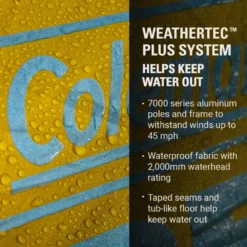 - WeatherTec™ system uses a tub-like floor, patented welded corners, while inverted seams and taped seams on rainfly and tent body help keep water out; durable frame is tested to withstand up to 35 mph winds